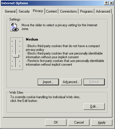 A number of alternatives exist if you are unhappy with this solution. Depending on the browser you use, cookies can be enabled selectively based on the type of cookie or the site they come from or even based on the privacy policy of the site sending the cookie. Such options are too many and varied to be explained here. If you are interested in these try the links at the top of the page or perform a search with the keywords 'cookies' and 'settings'.